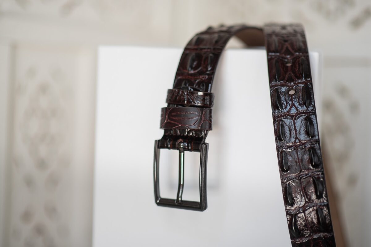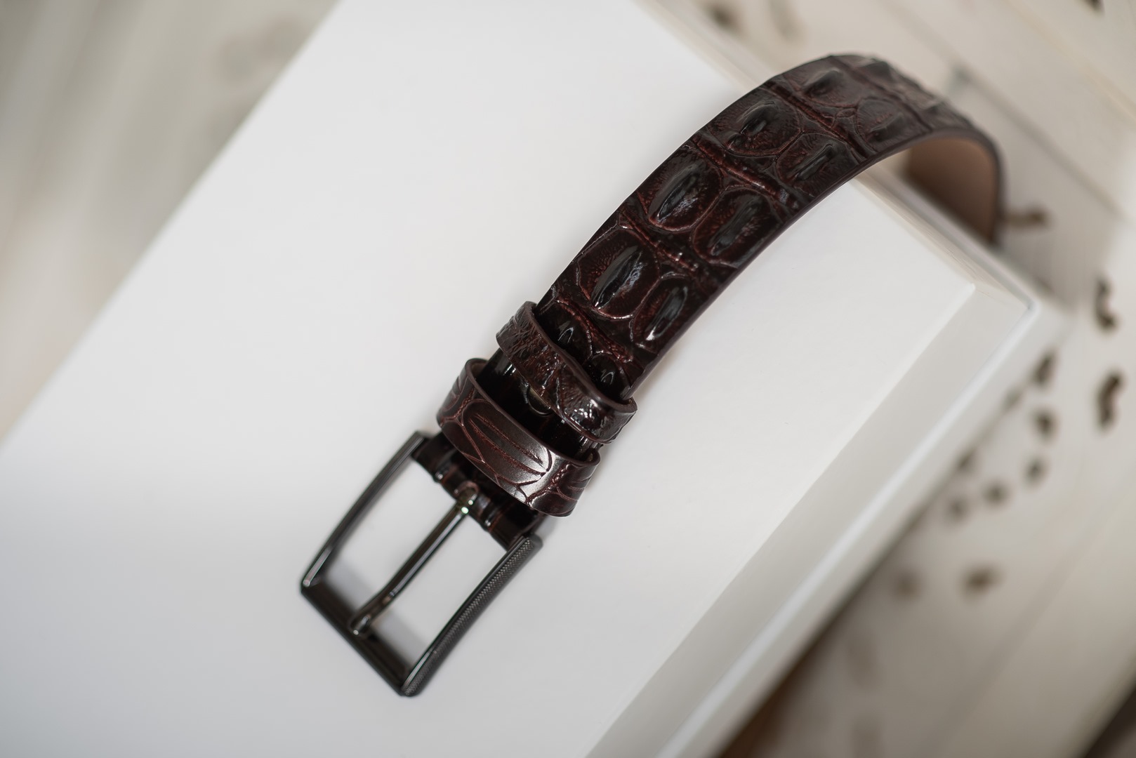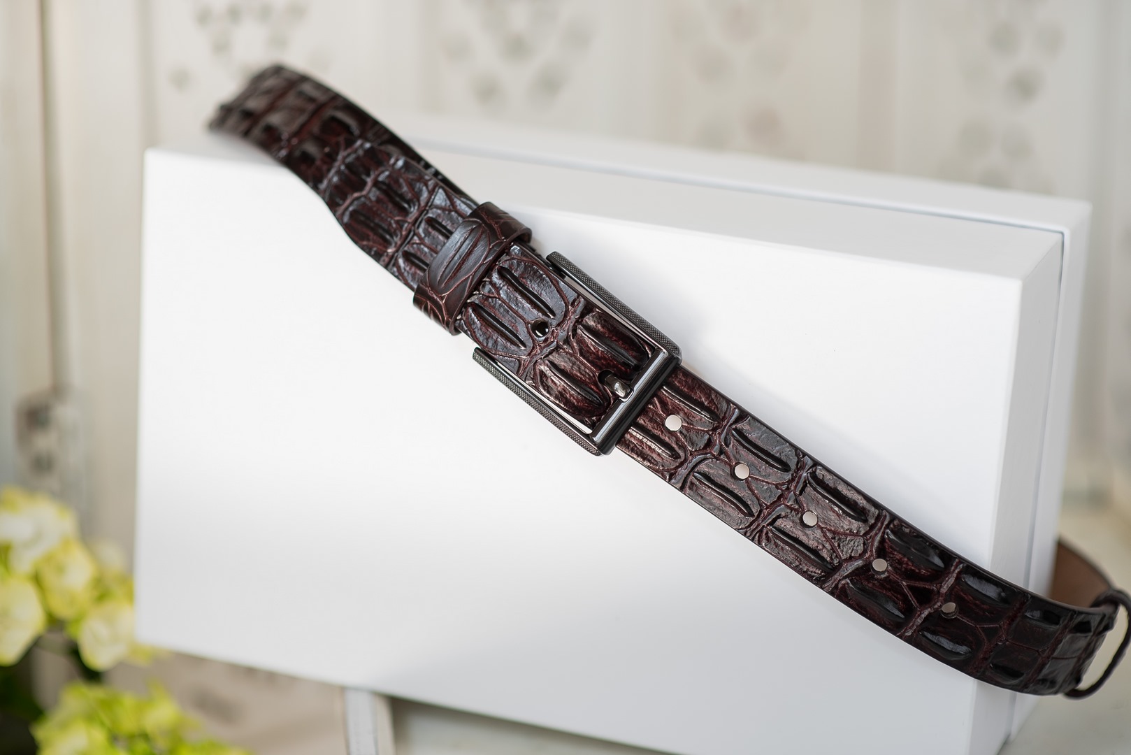 Премиальный бордовый ремень классической ширины мастера марки выполнили полностью вручную из натуральной кожи крокодила.