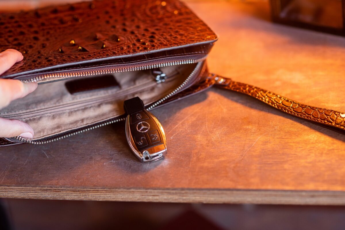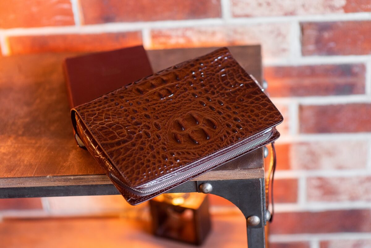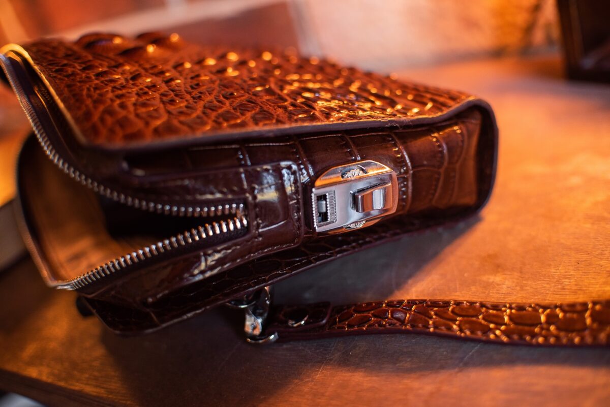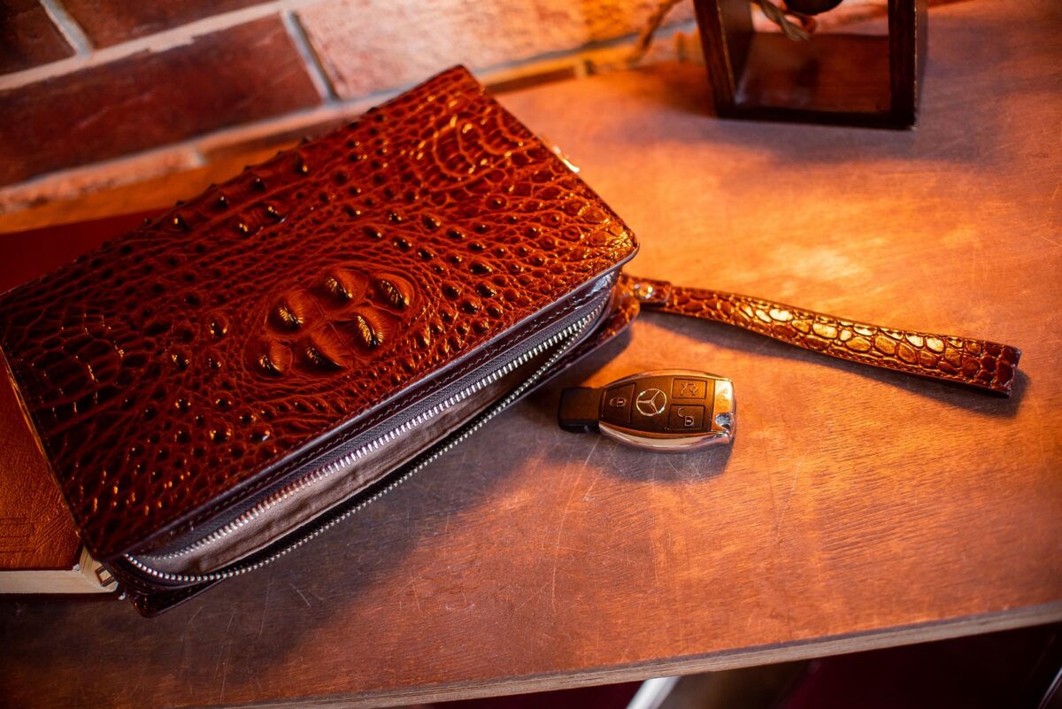 Барсетка коричневого цвета с короткой ручкой-петлей, благодаря которой аксессуар удобно носить на запястье, сшили из фактурной кожи крокодила.