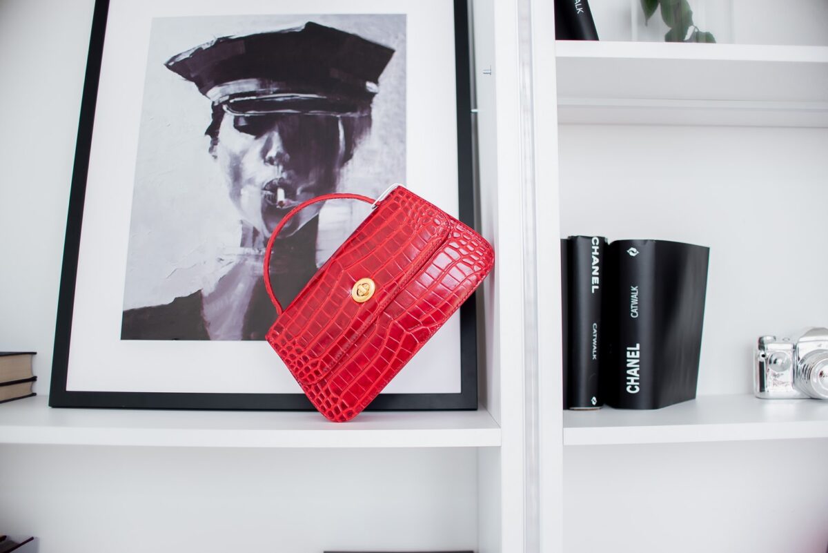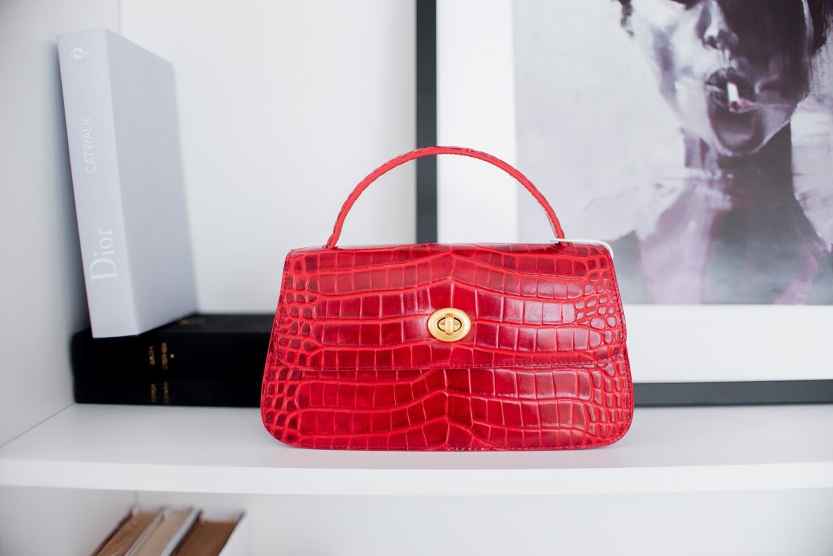 Дизайнерская сумка ручной работы из экзотической кожи крокодила в красном цвете, дополнена надежной фурнитурой в золотом оттенке.
