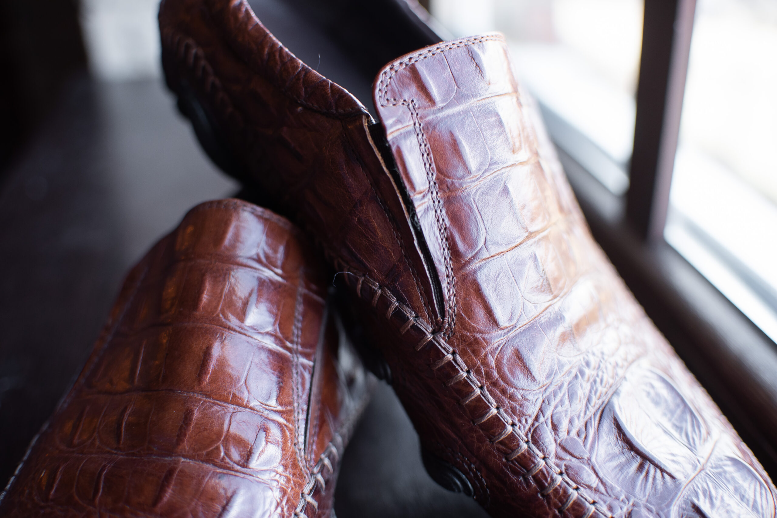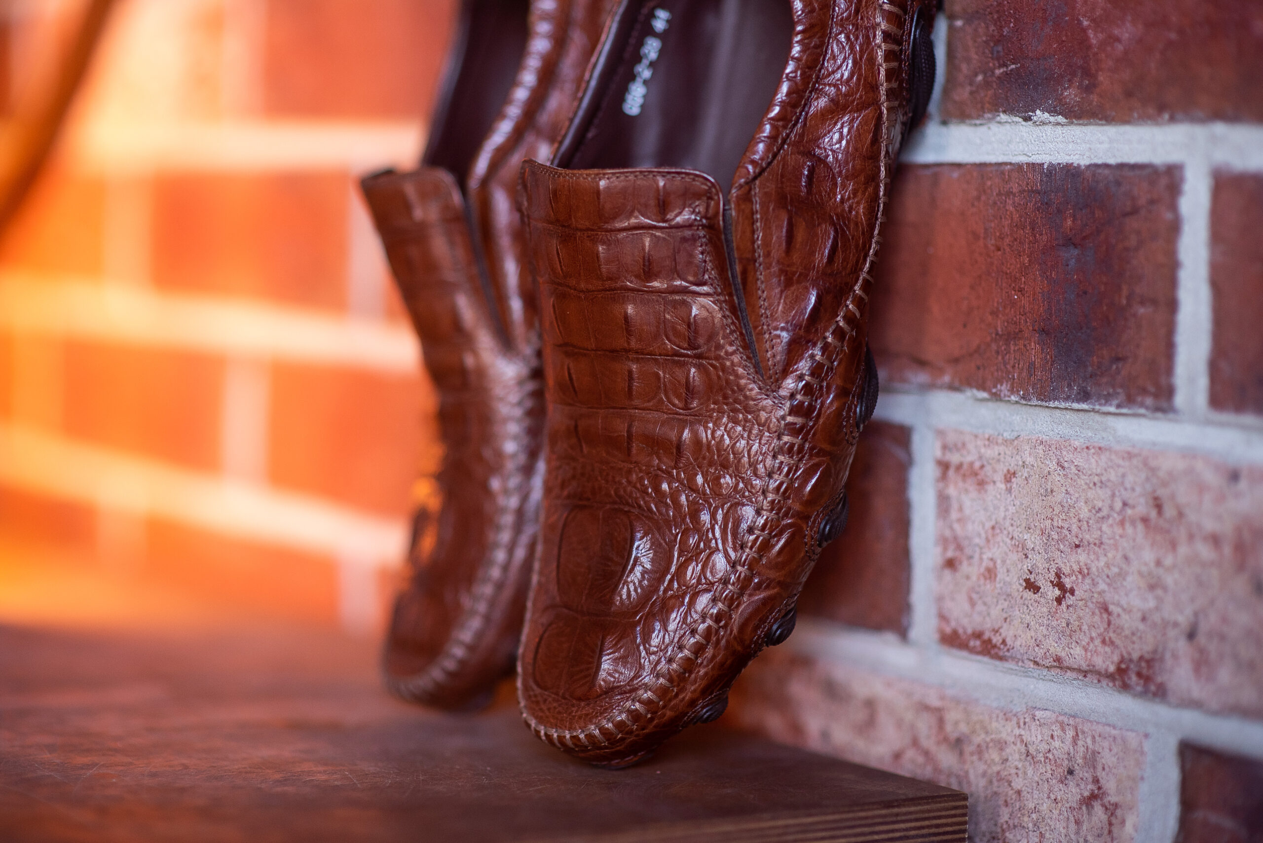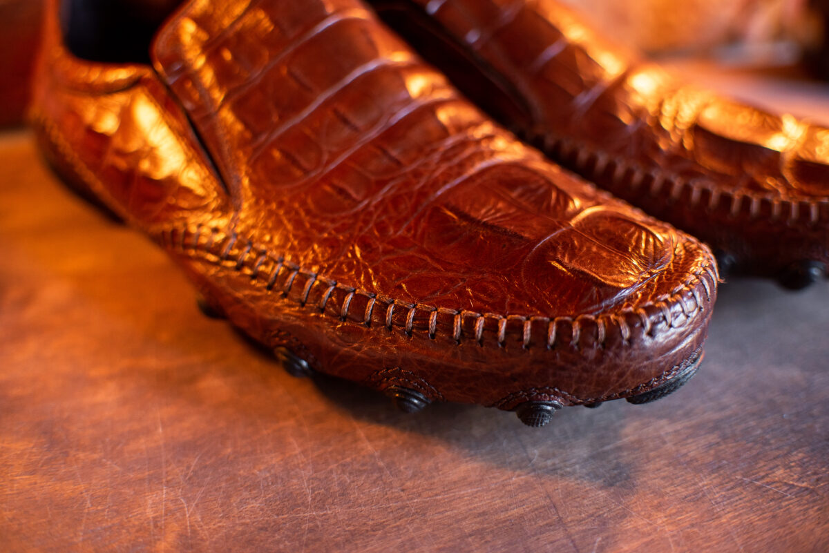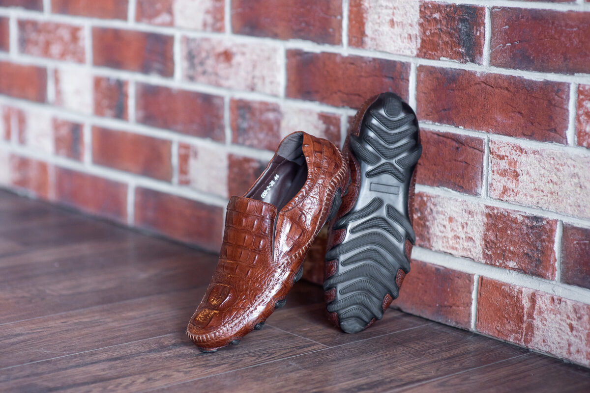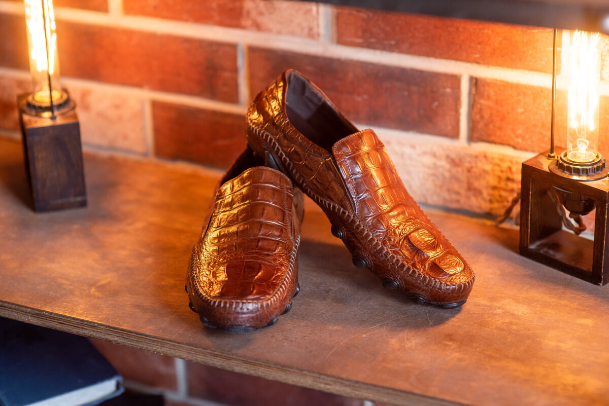 Бугристая натуральная кожа крокодила в коричневом цвете, рифленая подошва, полностью ручная работа.