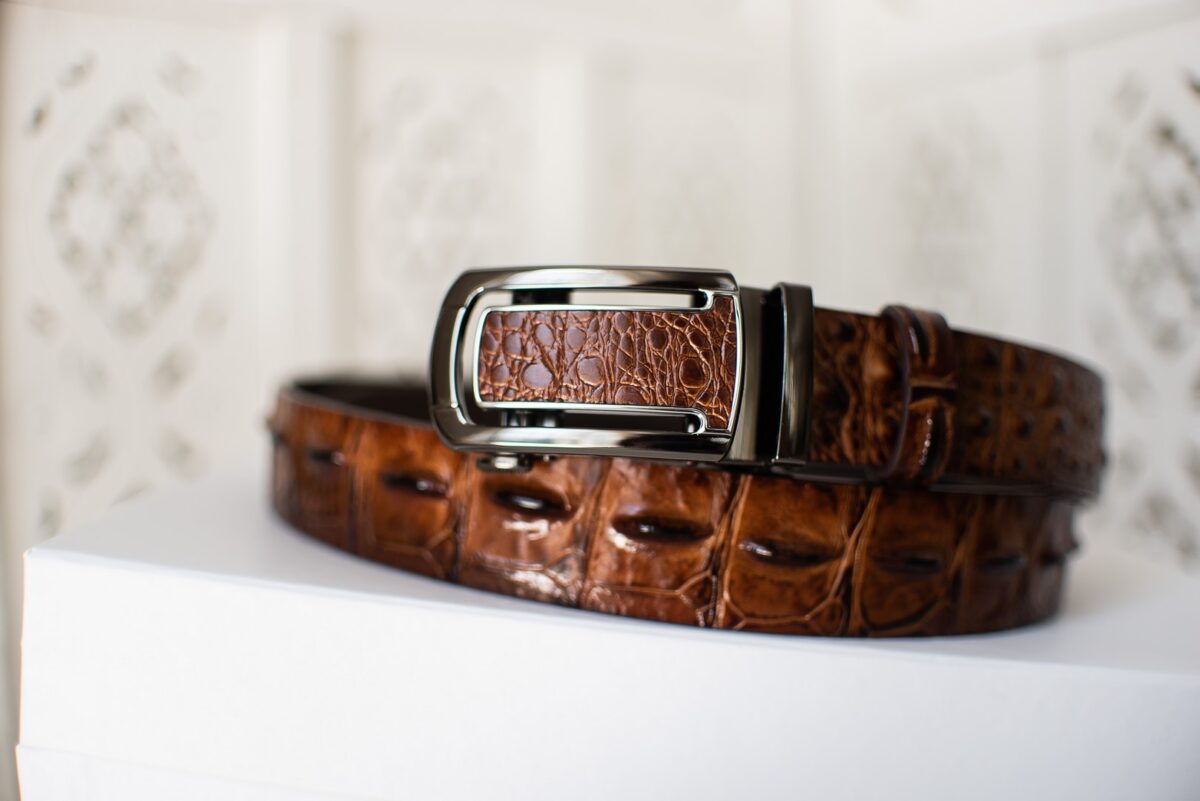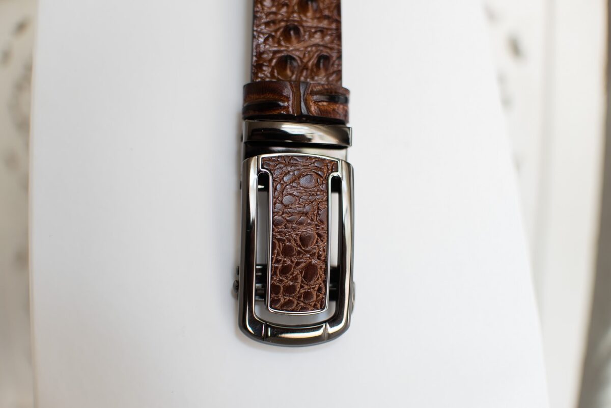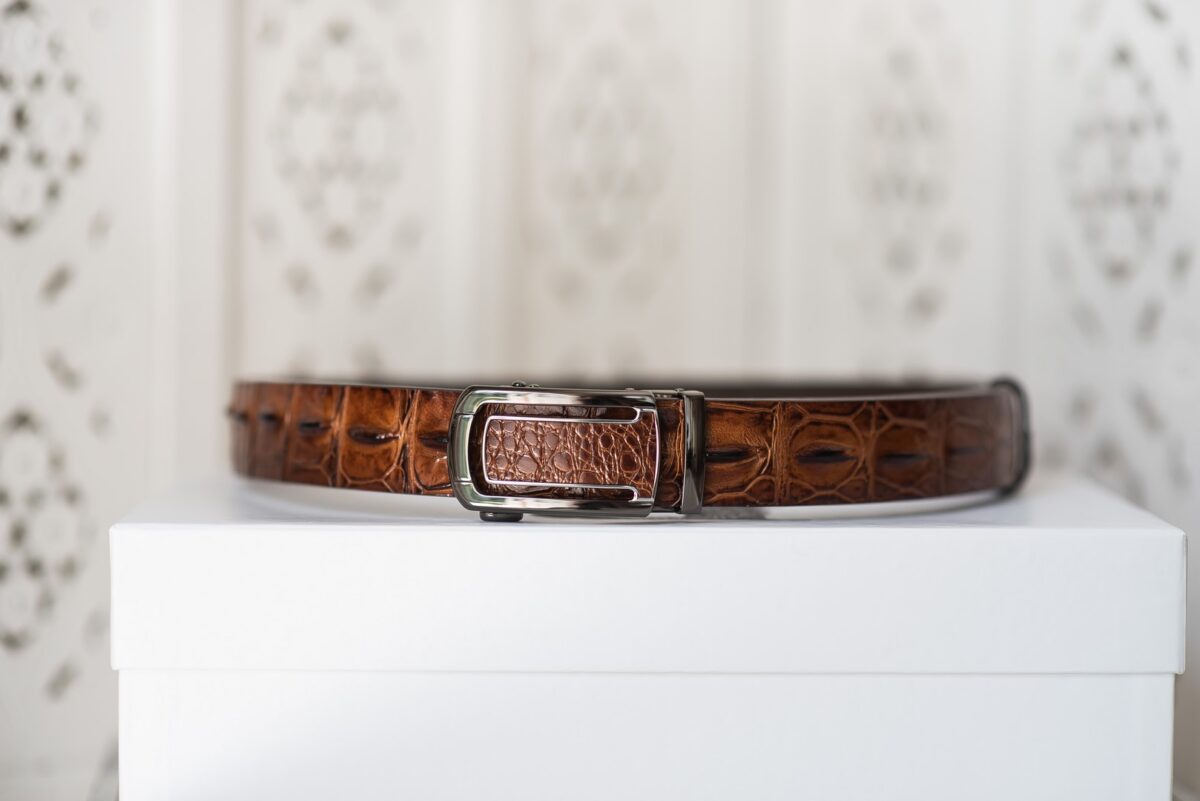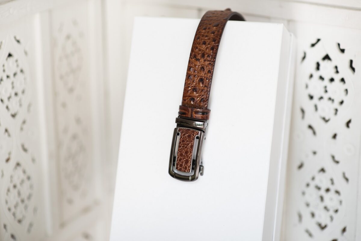 Аксессуар коричневого цвета из натуральной кожи рептилии регулируется.