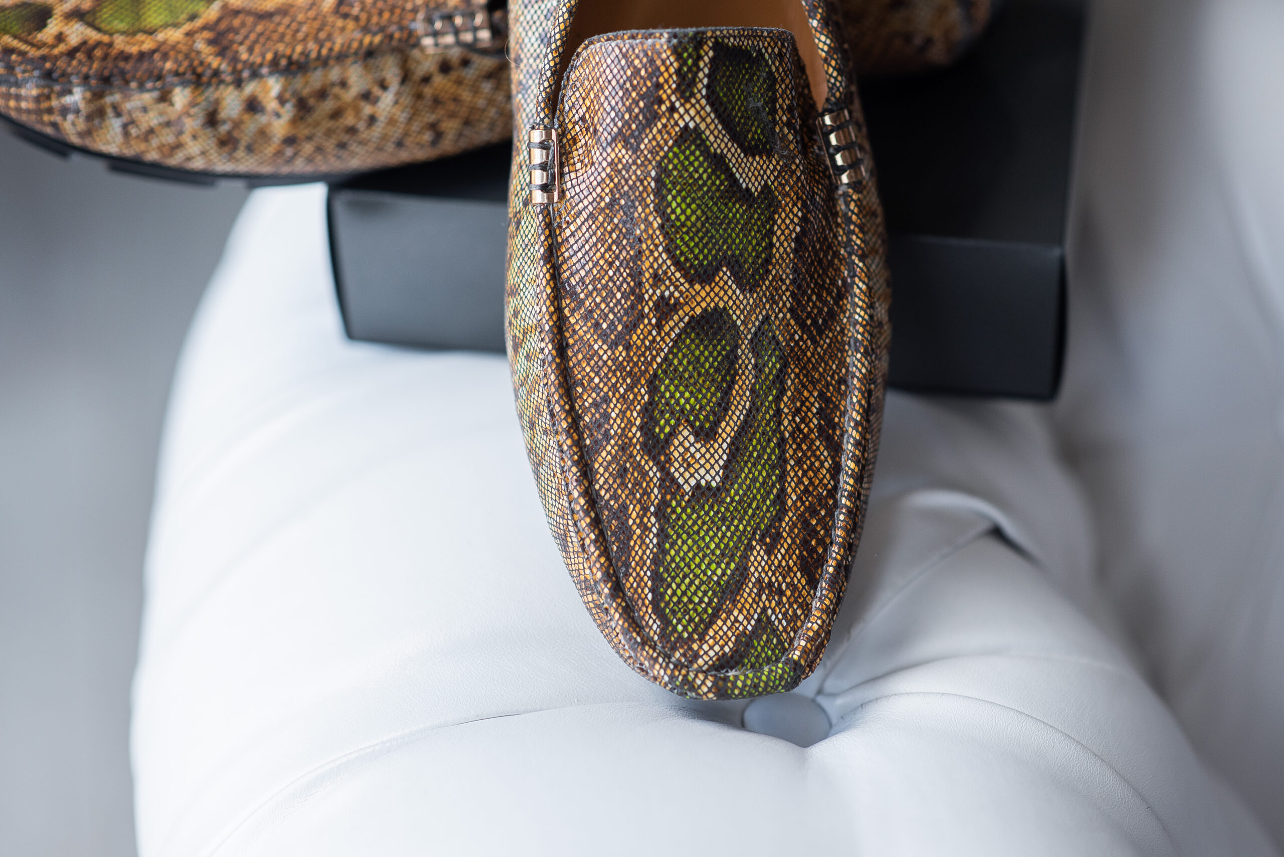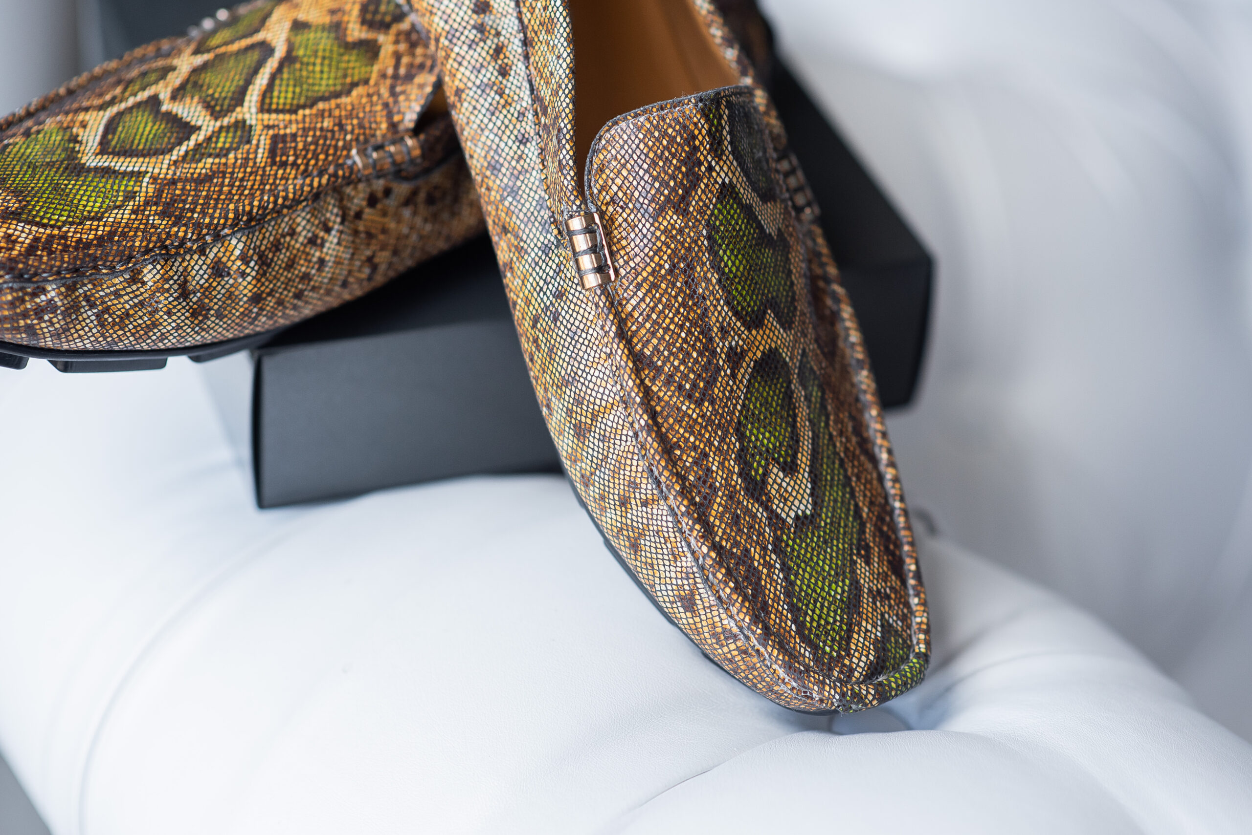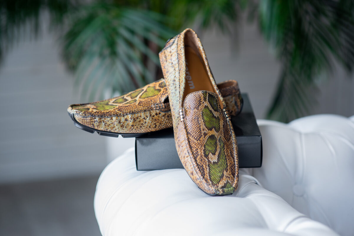 Экстравагантная мужская обувь из кожи морской змеи с фурнитурой в золотом оттенке: врезающаяся в память и покоряющая с первого взгляда.