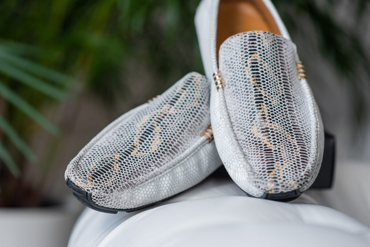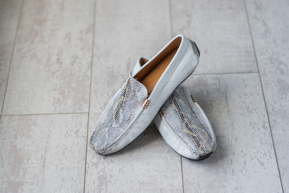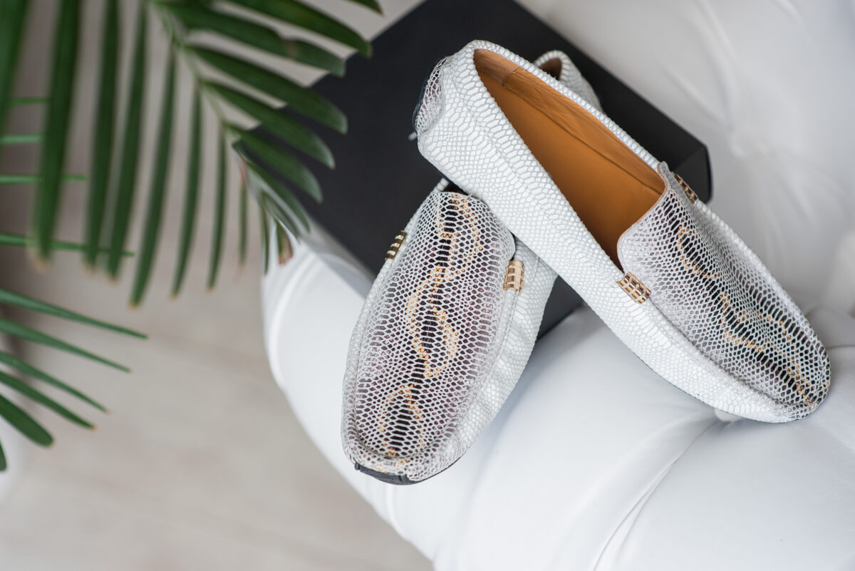 Экстравагантная мужская обувь из кожи морской змеи с фурнитурой в золотом оттенке: врезающаяся в память и покоряющая с первого взгляда.