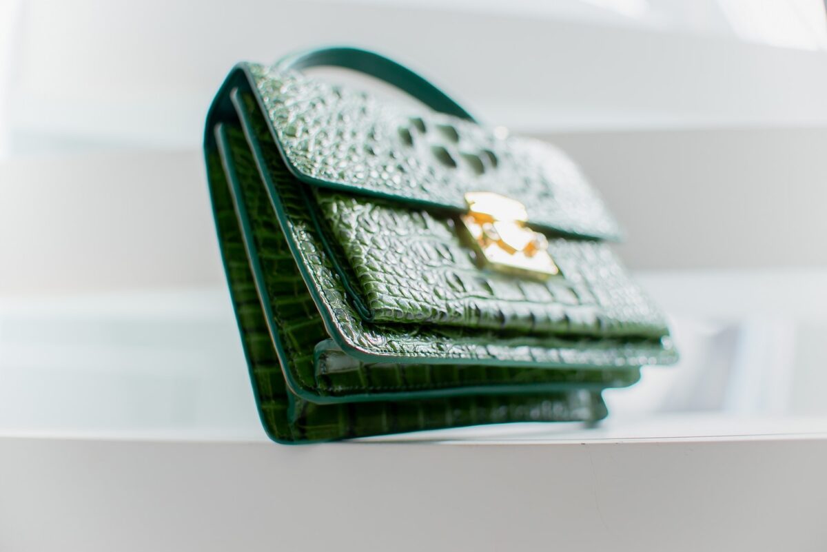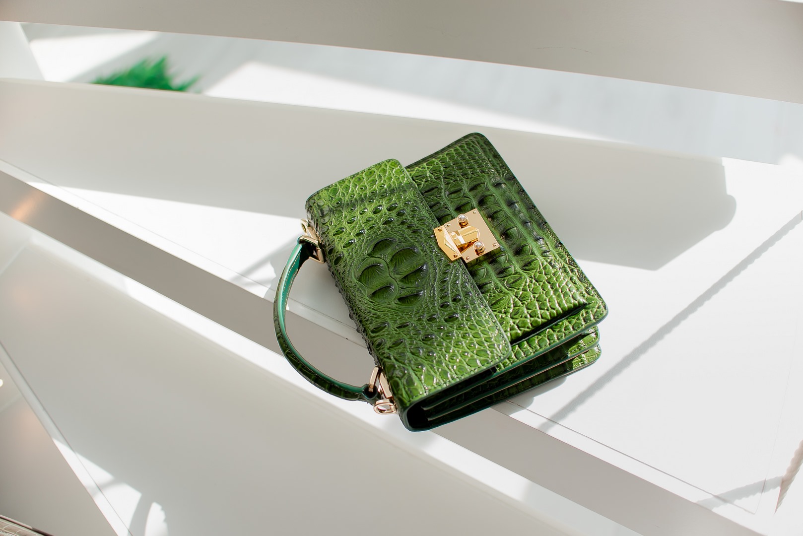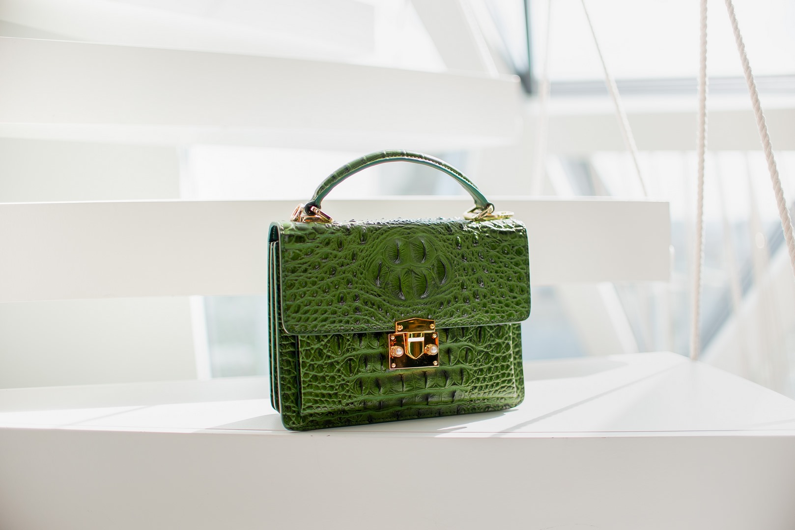 Для пошива этого аксессуара мастера марки Roco Lini выбрали натуральную кожу крокодила зелёного цвета.