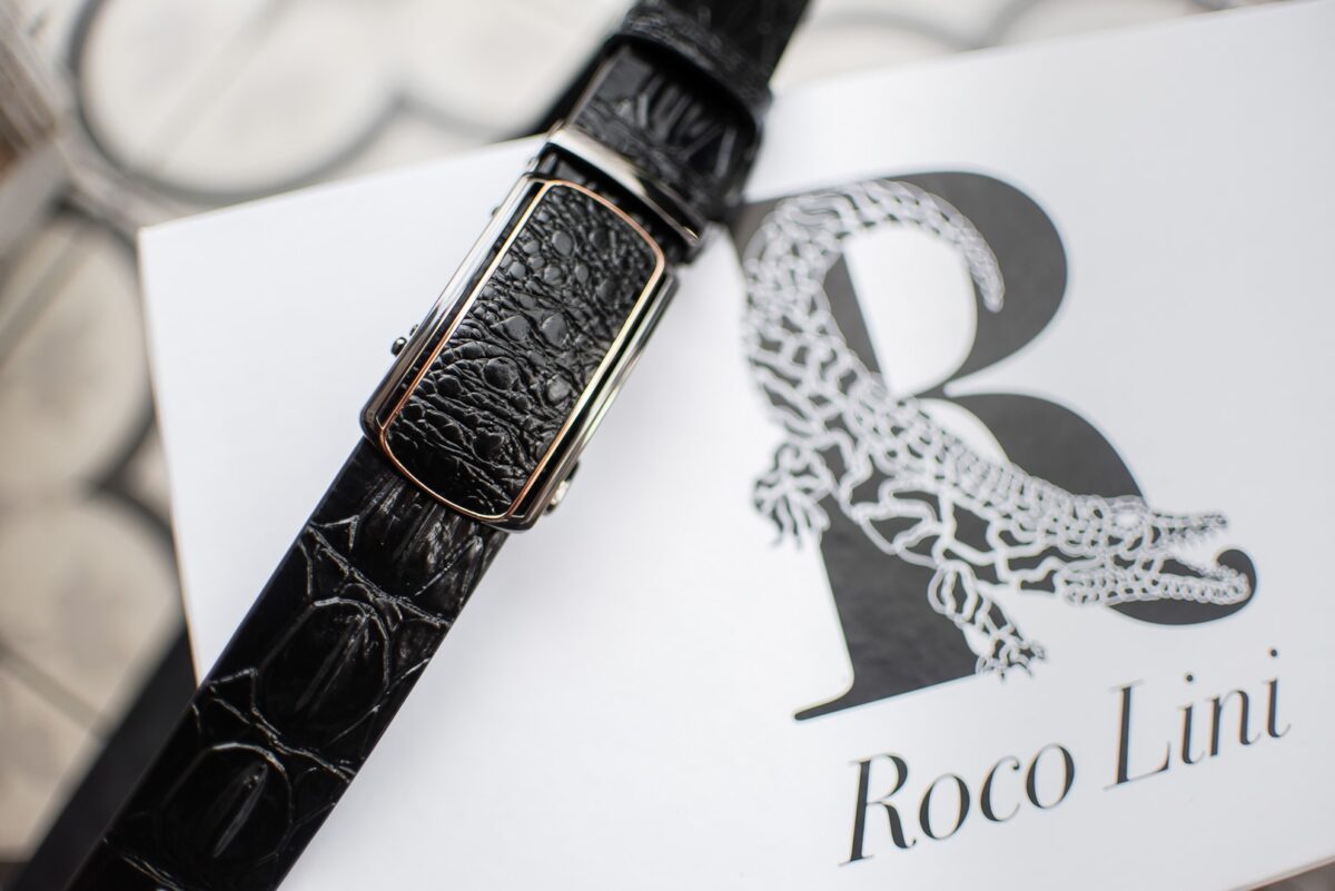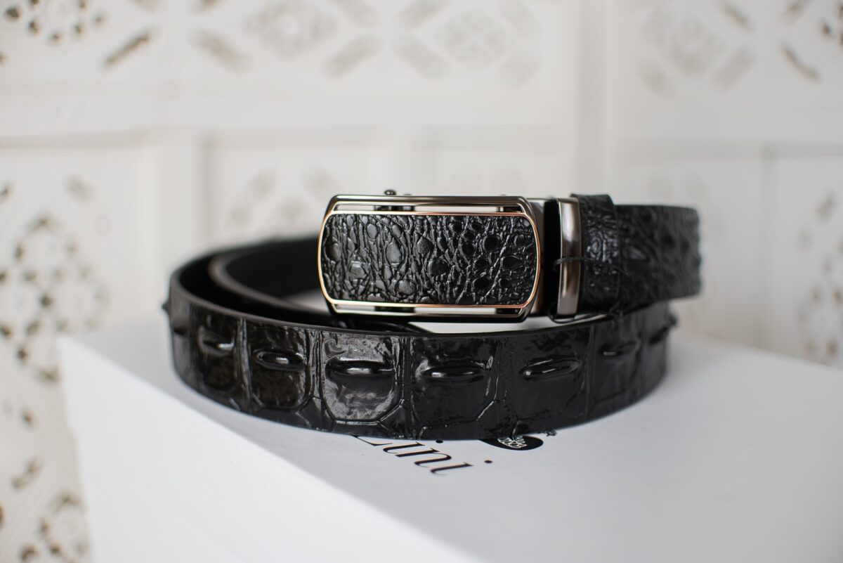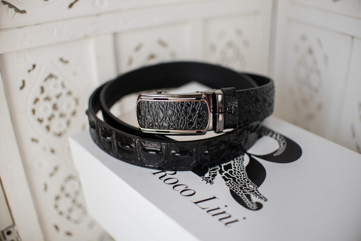 Премиальный мужской кожаный ремень Riccardo, выполнен в чёрном цвете с золотистой пряжкой из натуральной кожи крокодила.